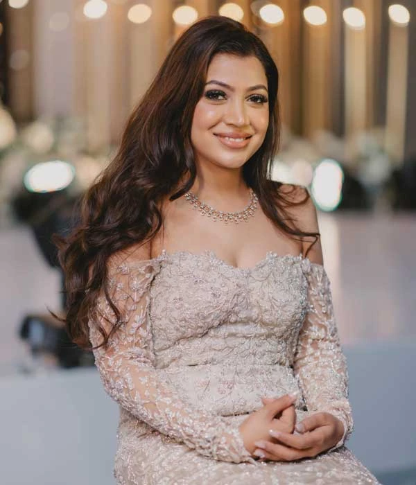 The skilled handwork on this gown is a true testament to fine craftsmanship. Intricately adorned with glass beads and tiny, hand-sewn flowers, each element is meticulously crafted to form a delicate yet elaborate design. The precision-set diamonds add a dazzling touch, reflecting light beautifully with every movement, ensuring you sparkle from every angle. The harmonious blend of these luxurious details from the shimmering beads to the expertly placed diamonds elevates this bridal gown to new heights of opulence. The result is a breathtaking creation that radiates elegance and sophistication, making it the latest designer gown for wedding celebrations where only the most exquisite will do. Perfect for a bride who desires to shine on her special day.