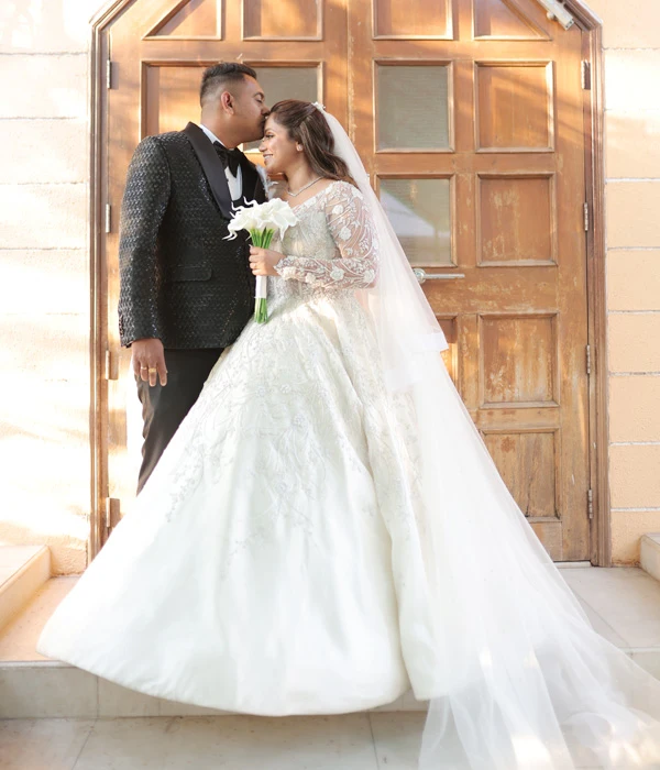 The expert handwork on this gown is a true showcase of exceptional craftsmanship. Adorned with intricate glass beads and delicate hand-sewn flowers, every detail is meticulously created to form an elaborate yet graceful design. Precision-set diamonds add a sparkling accent, catching the light beautifully with every movement, ensuring you shine from every angle. The seamless combination of these luxurious elements, from the shimmering beads to the carefully placed diamonds, elevates this bridal gown to unparalleled levels of opulence. The result is a breathtaking piece that exudes elegance and sophistication, making it the perfect designer gown for weddings where only the finest will do. Ideal for the bride who wishes to radiate brilliance on her special day.