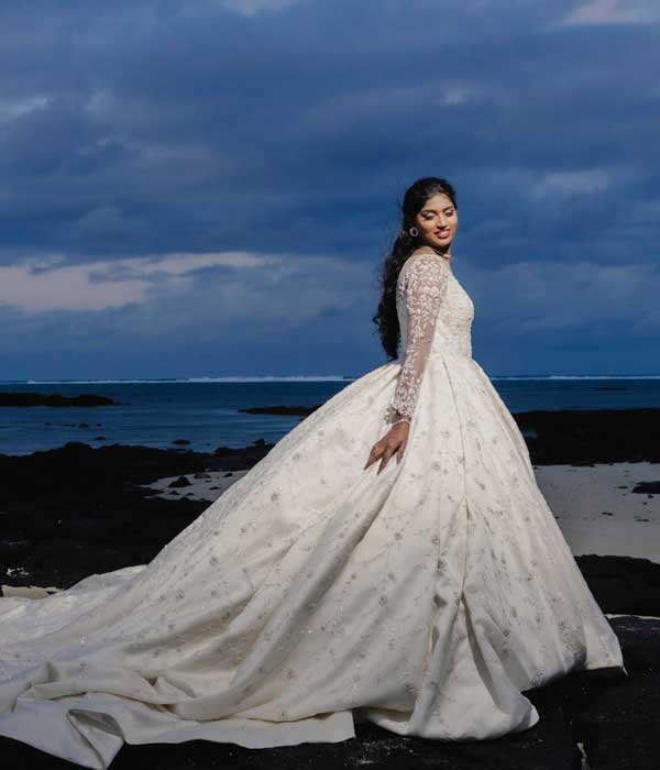Indulge in the epitome of luxury and sophistication with this exquisite white mermaid gown—a masterpiece of elegance. Adorned with intricate hand embroidery, every stitch is interwoven with delicate glass beads, luminous pearls, and sparkling diamonds, creating a design that radiates opulence. The flattering neckline accentuates your natural beauty, while the gown’s sleek, figure-hugging silhouette flows effortlessly into a long, graceful train. Each detail, from the precise handwork to the carefully placed embellishments, is crafted with exceptional care, creating a stunning blend of modern glamour and timeless allure. Designed by a leading white wedding designer in India, this gown is perfect for any formal occasion where you wish to captivate and shine.